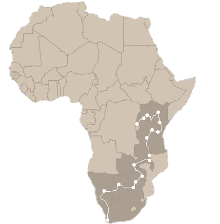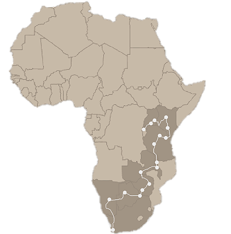 Rwanda, Uganda, Kenya, Tanzania, Malawi, Zambia, Zimbabwe, Botswana, Namibia, and South Africa.
